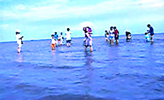 米草在我国安家落?簦?为我国海岸增添了?G色。大米草为我国的海岸保护立下了功劳。大米草在深秋季开始始泛?S,冬天你去那里,看到的是金?S色的大米草。第二年初春,它才慢慢泛绿。夏季是它生?L最?d兴旺的?r候,海岸一片翠?G,生机勃勃。潮水涨落、波浪?坝浚?大米草巍然不动,顽强地保护着海岸。 菩提岛赶海区还有一个美丽的名字“鬼蟹区”,“海滩蟹舞”的奇景就出现在这里,从每年的5月至10月,赶海区乐趣无穷。成群的鬼蟹生活在这里,个头从指甲盖大小到巴掌大小不等,夏秋季节,退潮之后,满地都是。可别小看他们,这些鬼蟹机灵的很,只要略有风吹草动,便立即爬回